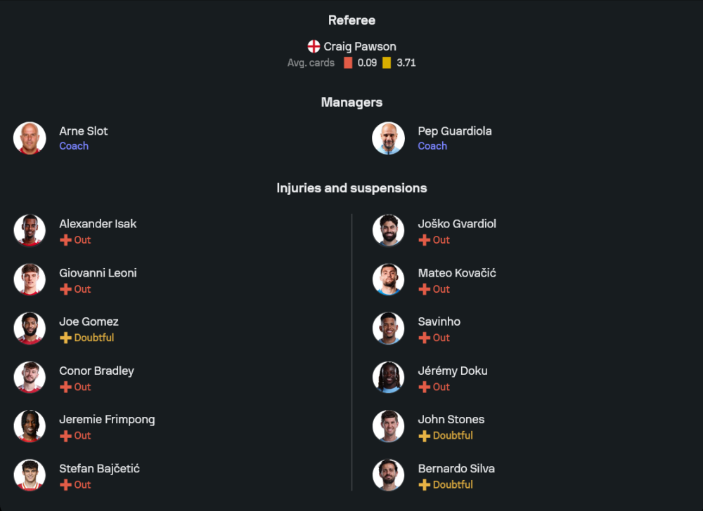 ฝั่งทีมเยือนของ เป๊ป กวาร์ดิโอล่า ยังต้องปวดหัวกับอาการบาดเจ็บของกองหลังตัวหลัก ยอสโก้ กวาร์ดิโอล และกองกลาง มาเตโอ โควาซิช รวมถึงปีกสปีดจัดอย่าง ซาวินโญ่ กับ เฌเรมี่ โดกู ที่ยังไม่พร้อม ส่วน จอห์น สโตนส์ กับ แบร์นาร์โด้ ซิลวา อยู่ในสถานะเช็กฟิต ซึ่งในแมตช์ใหญ่แบบนี้หากไม่สมบูรณ์จริง เป๊ปไม่น่าเสี่ยงใช้