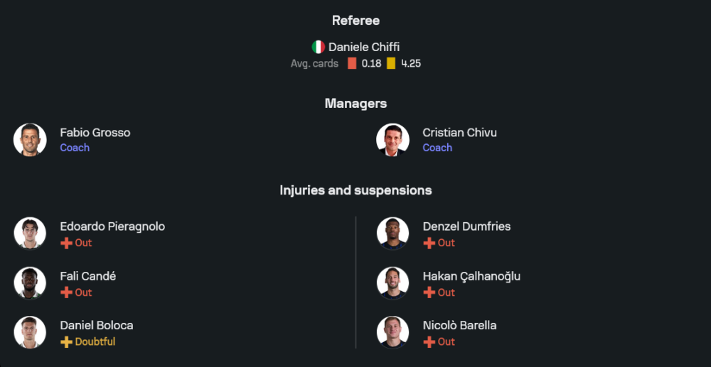 อย่างไรก็ตาม อินเตอร์ยังขาดผู้เล่นสำคัญหลายคน ทั้งเดนเซล ดุมฟรีส์, ฮาคาน ชัลฮาโนกลู, นิโคโล่ บาเรลล่า และคาร์ลอส ออกุสโต้ ที่เดี้ยงยาว แต่ด้วยขุมกำลังที่ลึกทำให้ไม่กระเทือนมาก คาดว่าจะจัดระบบ 3-5-2 นายด่านใช้ ยานน์ ซอมเมอร์ ยืนเฝ้าเสา สามเซ็นเตอร์เป็น ยานน์ บิสเซ็ค, มานูเอล อคานยี่ และอเลสซานโดร บาสโตนี่ วิงแบ็กขวาเป็นหลุยส์ เฮนริเก้ ด้านซ้ายใช้ดิมาร์โก้ แดนกลางสามตัวประกอบด้วย เปตาร์ ซูชิช, ปิโอตอร์ ซีลินสกี้ และเฮนริคห์ มคิตาร์ยาน คอยคุมจังหวะเกมรุก-รับ ส่วนคู่กองหน้าจัดเต็ม เลาตาโร่ มาร์ติเนซ ล่าตาข่ายร่วมกับมาร์คุส ตูราม เหมือนเดิม