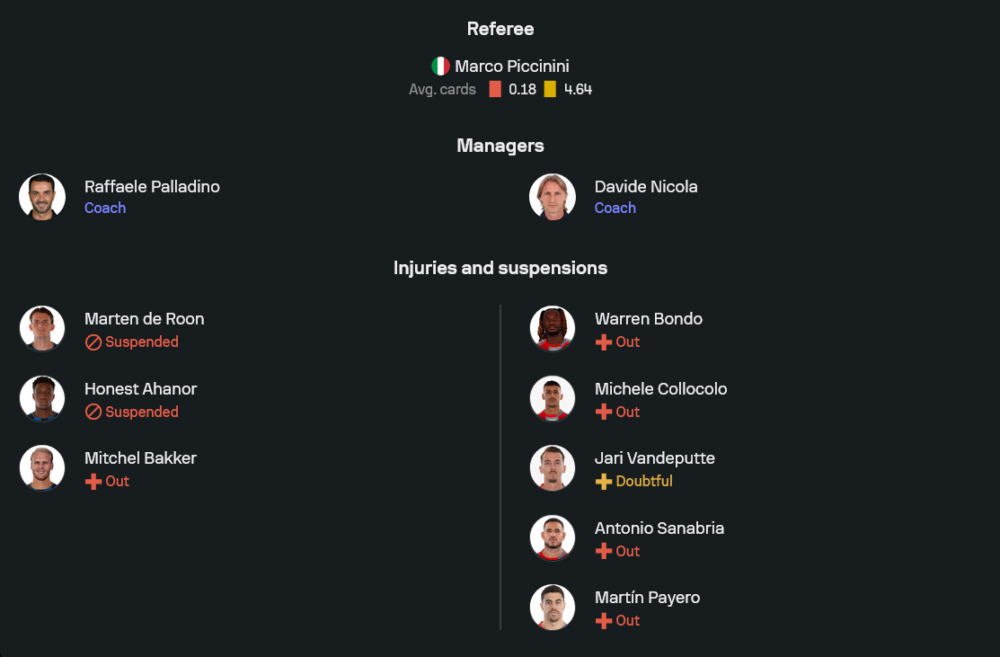 ฝั่งอตาลันต้าของกุนซือราฟฟาเอเล่ ปัลลาดิโน่ กำลังอยู่ในช่วงขาขึ้นแต่ก็มีปัญหาเรื่องตัวผู้เล่นให้ต้องขบคิดเล็กน้อย แผงกลางเสียกำลังหลักอย่างมาร์เทน เดอ รูน ที่ติดโทษแบน รวมถึงแนวรับดาวรุ่ง ฮอนเนสต์ อาฮานอร์ ที่โดนใบแดงในเกมลีกล่าสุดทำให้ชวดช่วยทีมแน่นอน อีกคนคือมิทเชล บัคเกอร์ที่ยังไม่พร้อมลงสนาม