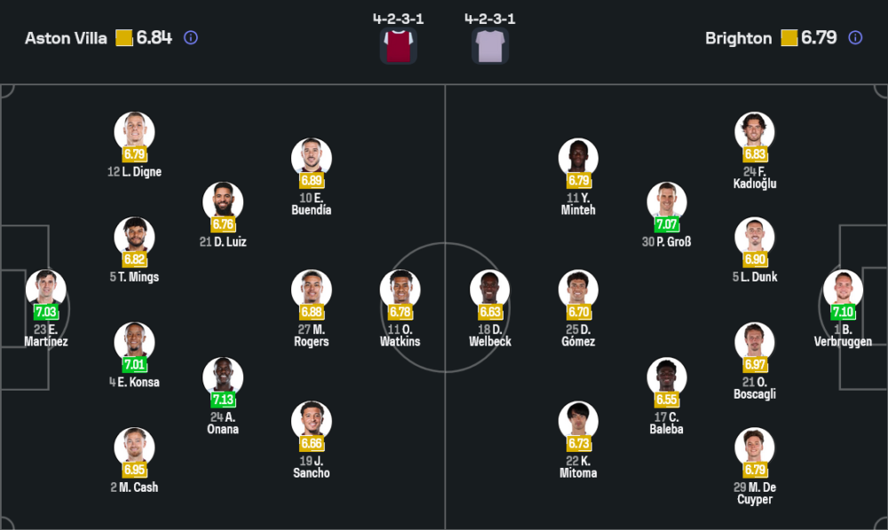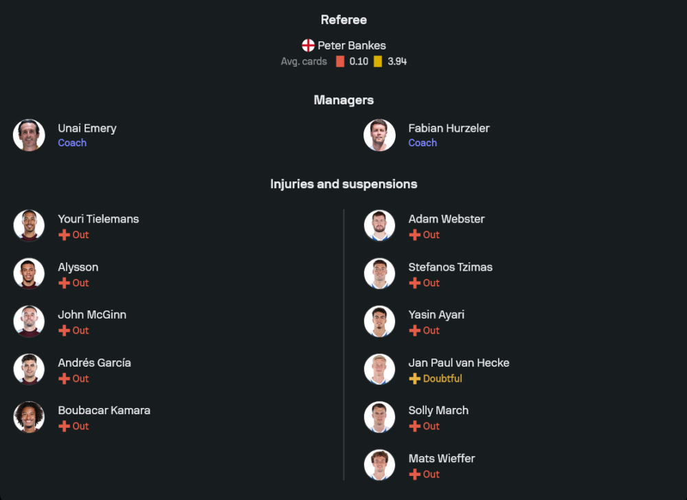 ลูกทีมของ อูไน เอเมรี่ ยังมีปัญหาตัวเจ็บต่อเนื่อง ไล่ตั้งแต่ ยูรี่ ตีเลอม็องส์, อลิสซง, จอห์น แม็กกินน์, อันเดรส การ์เซีย ไปจนถึง บูบาก้าร์ กามาร่า ที่ต้องนั่งดูเพื่อนอยู่ข้างสนามทั้งหมด ทำให้การจัดทัพต้องพึ่งแกนหลักชุดเดิมแบบยกแพ็ก คาดว่าจะมาในระบบ 4-2-3-1 ผู้รักษาประตูใช้ เอมิเลียโน่ มาร์ติเนซ ยืนเฝ้าเสา แผงหลังสี่คนเป็น แม็ตตี้ แคช, เอซรี่ คอนซ่า, ไทโรน มิงส์ และ ลูก้าส์ ดีญ คู่กลางใช้ ดั๊กลาส ลุยซ์ จับคู่กับ อมาดู โอนาน่า ช่วยตัดเกมและเชื่อมบอล ขณะที่สามตัวรุกด้านบนมี เจดอน ซานโช่ ทางขวา อมาดู โอนาน่า หรือ มอร์แกน โรเจอร์ส ขยับขึ้นมาช่วย เอมิเลียโน่ บูเอนเดีย ทำเกมอยู่หลังหัวหอกตัวเป้าคือ โอลลี่ วัตกิ้นส์ ที่พร้อมไล่บี้แนวรับคู่แข่งตลอด 90 นาที