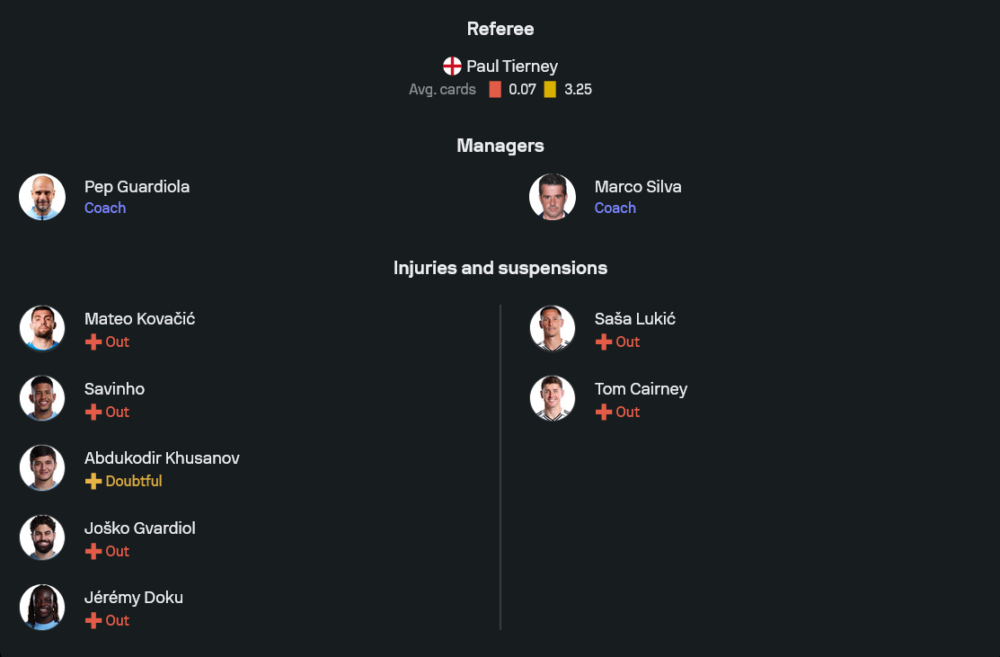 ซิลวาน่าจะวางหมากในระบบ 4-2-3-1 แบร์นด์ เลโน่ รับบทนายทวาร แผงหลังสี่คนมี ติโมธี่ กาสตาญ, โยอาคิม แอนเดอร์เซ่น, ฆอร์เก้ กูเอนก้า และ ไรอัน เซสเซญง เรียงตัวป้องกันหน้าเขตโทษ คู่มิดฟิลด์ตัวต่ำใช้ ซานเดอร์ เบอร์เก้ ประสานกับ อเล็กซ์ อิโวบี้ เพื่อพยายามหยุดเกมรุกตรงกลางของเจ้าถิ่น ขณะที่สามตัวรุกด้านหลัง ราอูล ฆิเมเนซ ประกอบด้วย แฮร์รี่ วิลสัน ทางขวา เอมิล สมิธ โรว์ ยืนเพลย์เมคเกอร์ และ ซามูเอล ชุควูเอเซ่ คอยโจมตีทางซ้าย เน้นสปีดและความคล่องตัวเล่นงานแนวรับซิตี้เวลาสวนกลับ