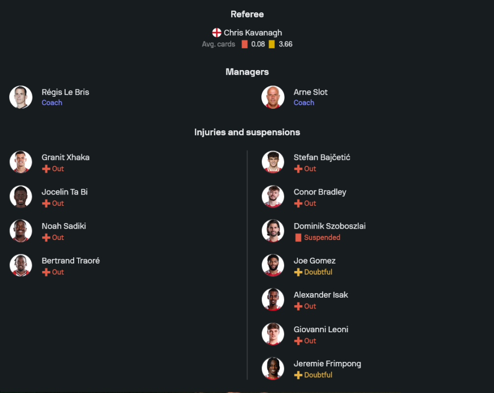 ทีมเยือนของ อาร์เน่อ สล็อต เจอปัญหาสำคัญเมื่อ โดมินิค โซโบสไล มิดฟิลด์ตัวขับเคลื่อนเกมรุกติดโทษแบนจากใบแดงเกมล่าสุด แถมยังมีแข้งบาดเจ็บค้างสต๊อกทั้ง สเตฟาน บายเซติช, เจเรมี่ ฟริมปอง, อเล็กซานเดอร์ อิซัค, โจวานนี่ เลโอนี่ และ คอเนอร์ แบร็ดลี่ย์ ทำให้ตัวเลือกในแนวรับและแนวรุกบางตำแหน่งเหลือน้อยลง