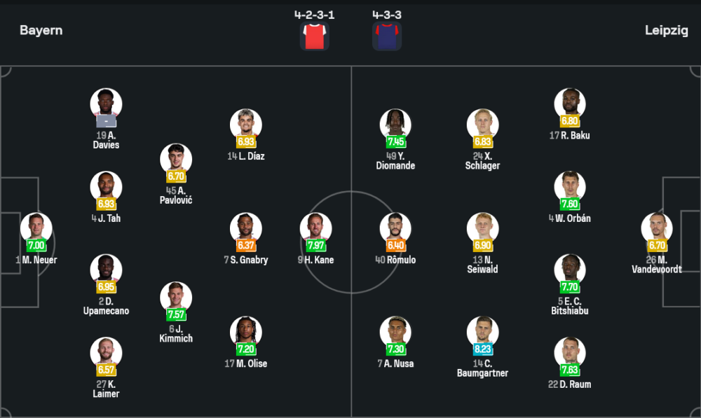 เสือใต้ของวินเซนต์ กอมปานีจัดทัพมาในระบบ 4-2-3-1 ที่เน้นเกมรุกจัดเต็มเหมือนเดิม ภายใต้การเฝ้าเสาของ มานูเอล นอยเออร์ แผงแบ็กโฟร์เรียงจากขวาไปซ้ายเป็น คอนราด ไลเมอร์, ดาโยต์ อูปาเมกาโน่, โจนาธาน ทาห์ และ อัลฟอนโซ่ เดวีส์ คู่มิดฟิลด์ตัวกลางใช้ โยชัว คิมมิช ยืนคุมจังหวะร่วมกับ อเล็กซานเดอร์ พาฟโลวิช ด้านแนวรุกสามตัวหลังหอกเป็น ไมเคิล โอลิเซ่, เซิร์จ นาบรี และหลุยส์ ดิอาซ ที่กำลังมั่นใจสุดขีดหลังเพิ่งกดแฮตทริกในลีกนัดล่าสุด โดยมี แฮร์รี่ เคน ยืนหอกเป้าไล่ล่าตาข่ายต่อเนื่อง แม้ว่าจะมีชื่อ ลีออน คลานัก กับ สเวน อูลไรช์ เจ็บพักอยู่ในลิสต์ แต่โดยรวมแล้วโครงสร้างหลักของทีมยังสมบูรณ์และพร้อมบวกเต็มพิกัด