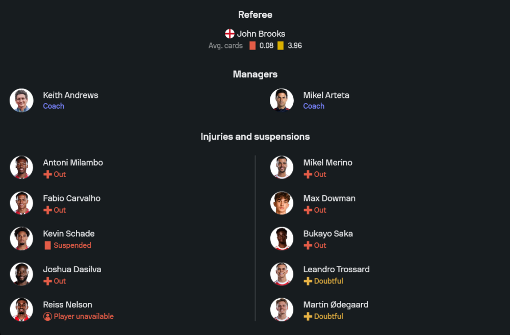 อีกจุดที่น่าจับตาคือการทำงานของผู้ตัดสิน จอห์น บรู้คส์ ที่สถิติให้ใบเหลืองเฉลี่ยเกือบ 4 ใบต่อเกม หากเกมตึงเครียดและมีการเข้าปะทะหนักๆ โอกาสเห็นฟาวล์บ่อยและเกมถูกตัดจังหวะก็มีสูง ซึ่งจะยิ่งเข้าทางเจ้าบ้านที่ต้องการทำลายจังหวะการเซ็ตเกมของอาร์เซนอลอยู่แล้ว