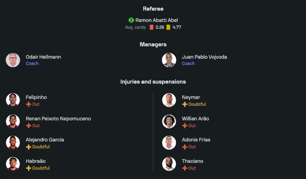 ฝั่งผู้มาเยือนที่นำทัพโดยกุนซือฮวน ปาโบล วอจโวดา ต้องปวดหัวกับอาการบาดเจ็บของแข้งตัวหลักหลายราย เริ่มตั้งแต่ เนย์มาร์ ที่มีปัญหาเข่ายังไม่สมบูรณ์เต็มร้อย สถานะใกล้เคียงกับ “เสี่ยงลงไม่ได้” ตามมาด้วย วิลเลียน อาราโฆ ที่ต้องพักยาว รวมถึงสองแนวรับอย่าง อโดนิส ฟริอัส และทาซิอาโน ที่มีอาการกล้ามเนื้อเล่นงาน ทำให้ตัวเลือกในแผงหลังและเกมรุกต้องปรับหมากกันพอสมควร