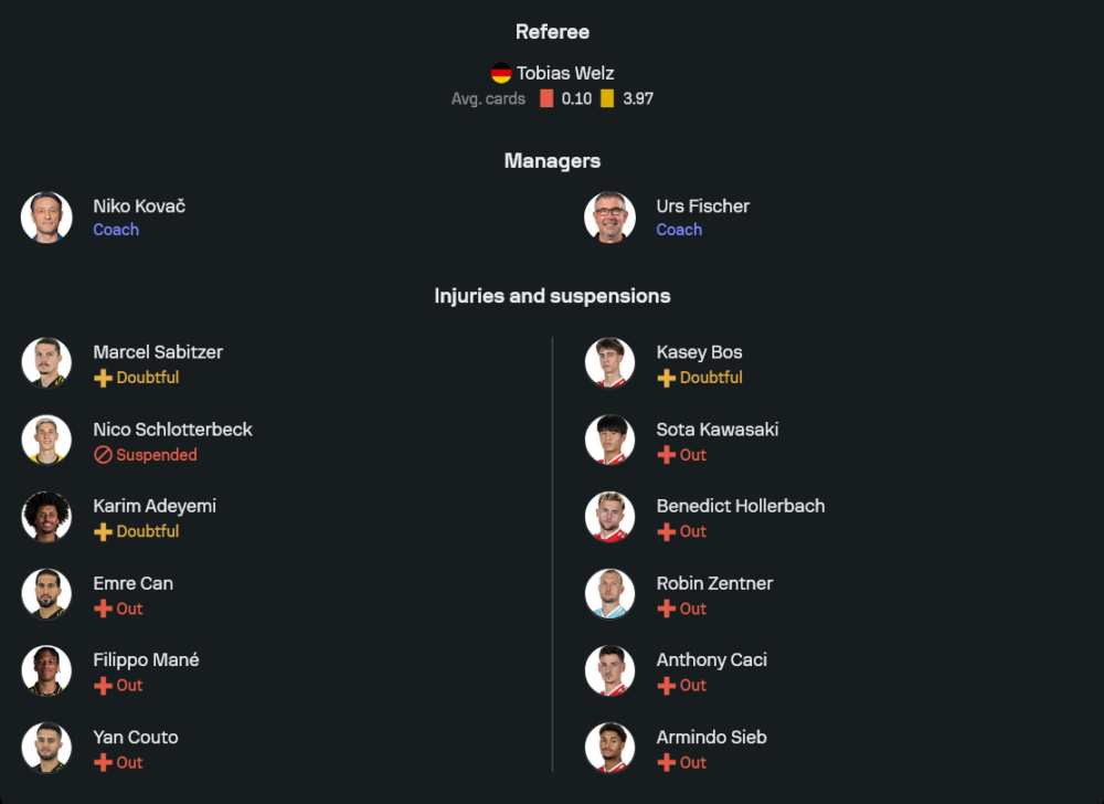 สภาพทีมมีผู้เล่นบาดเจ็บหลายราย ทั้งโรบิน เซนต์เนอร์ นายด่านมือหนึ่ง, แอนโธนี่ คาซี, เบเนดิคต์ โฮเลอร์บัค, โซตะ คาวาซากิ และ อาร์มินโด้ ซีบ ขณะที่ เคซี่ย์ บอส ยังต้องเช็กฟิต แต่โครงหลักในสนามยังถือว่าพร้อมรบเต็มร้อย