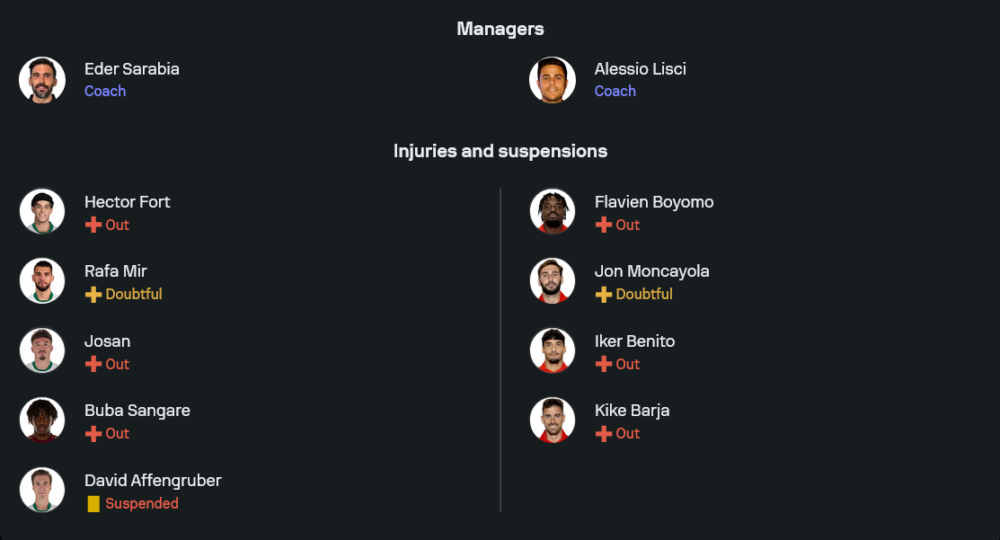 ฝั่งเจ้าถิ่นของกุนซือ เอเดร์ ซาราเบีย เจอปัญหาใหญ่คือฟอร์มตกต่อเนื่อง 7 นัดหลังรวมทุกรายการยังไม่ชนะใคร แถมเกมรับมีช่องโหว่ให้คู่แข่งเจาะได้ตลอด ความพร้อมก่อนเกมนี้ยังต้องเสียกองหลังตัวสำคัญอย่าง ดาวิด อัฟเฟนกรูเบอร์ ที่ติดโทษแบน ขณะที่ เฮคเตอร์ ฟอร์ต, โฆซาน และดาวยิงอย่าง ราฟา มีร์ ยังมีปัญหาอาการบาดเจ็บ บวกกับแนวรับสำรอง บูบา ซ็องกาเร่ ที่ต้องพักยาว ทำให้ตัวเลือกในแผงหลังหายไปหลายราย