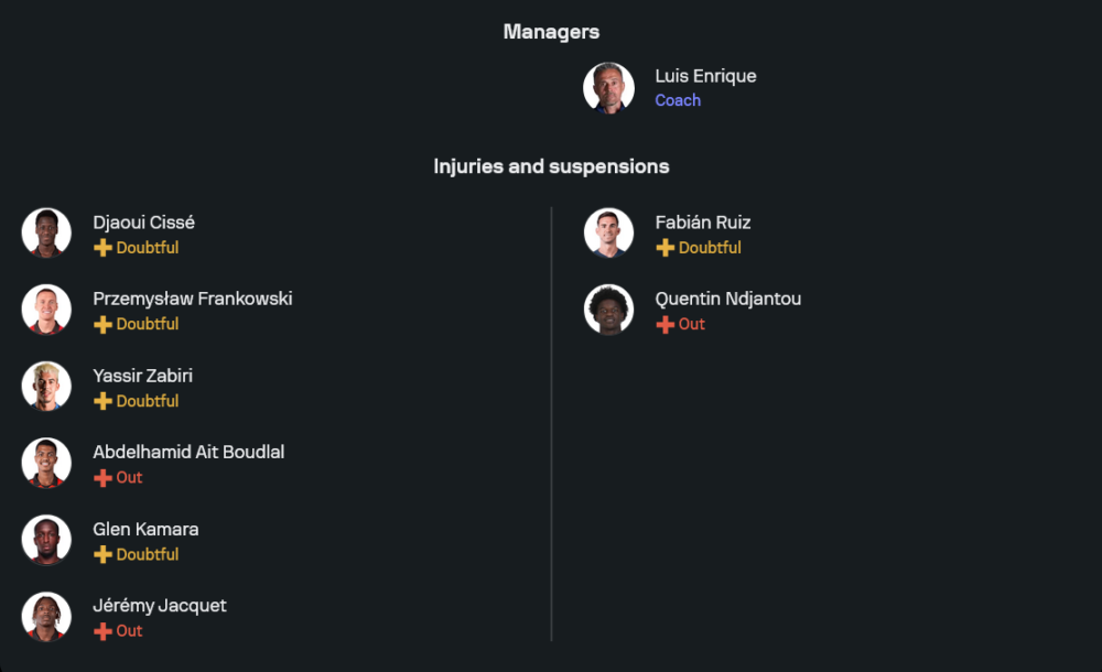 ด้านทีมเยือนของกุนซือ หลุยส์ เอ็นรีเก้ กำลังมั่นใจสุดๆ หลังเข็นทีมถล่มมาร์เซย์ 5-0 ในเกมลีกนัดก่อน แผนการเล่นยึดระบบ 4-3-3 ตามถนัดของนายใหญ่ชาวสเปน ผู้รักษาประตูใช้ มาตเวย์ ซาโฟนอฟ ยืนเฝ้าเสา แผงแบ็กโฟร์วาง อัชราฟ ฮาคิมี ยืนขวา นูนู เมนเดส ประจำการซ้าย คู่เซ็นเตอร์เป็น มาร์กินญอส จับคู่กับ วิลเลียม ปาโช
