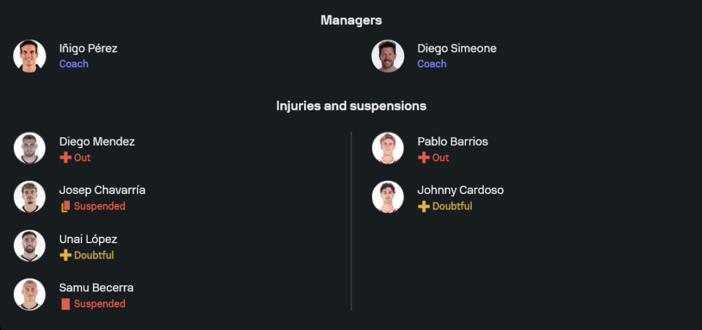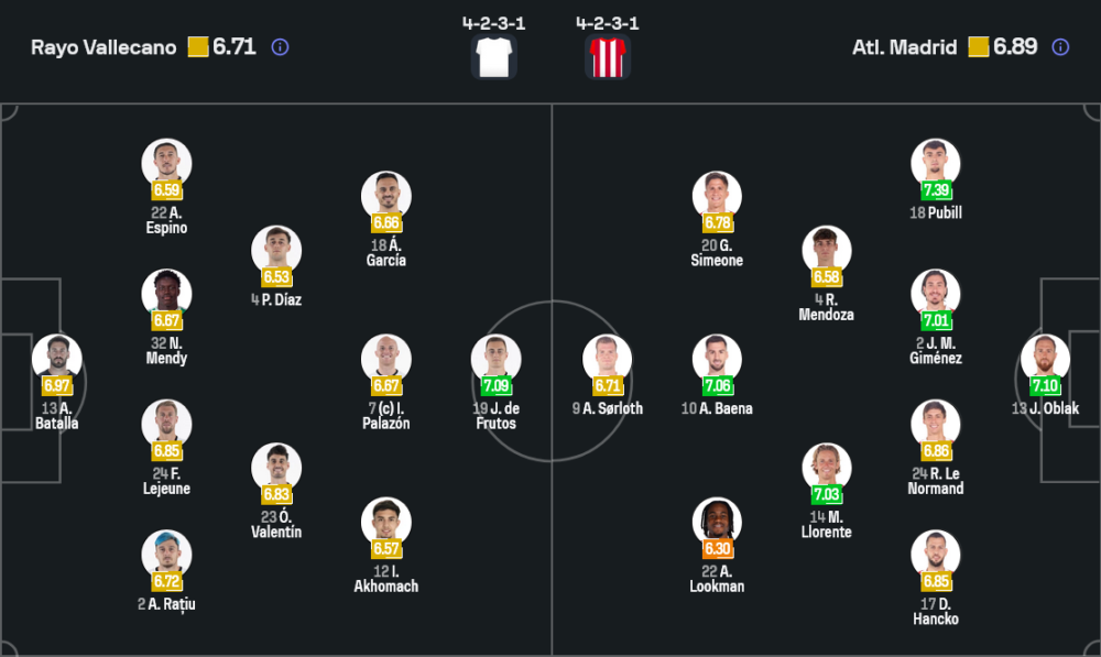 ฝั่งเจ้าถิ่น ราโยของโค้ช อีญิโก้ เปเรซ ยังคงมีปัญหาเรื่องตัวผู้เล่นให้ปวดหัว ไล่ตั้งแต่ ดิเอโก เมนเดซ ที่เจ็บยาว, โฆเซป ชาบาร์เรีย กับ ซามู เบร์เซร์รา ที่ติดโทษแบน และ อูไน โลเปซ ที่ยังต้องเช็กสภาพความฟิต อย่างไรก็ตามแกนหลักในแดนหลังยังอยู่ครบ ออกุสโต้ บาตาย่า ลงเฝ้าเสา มีแผงแบ็กโฟร์ประกอบด้วย อันเดร ราติอู, ฟลอริย็อง เลอฌวน, โนเบล เมนดี้ และ อัลฟอนโซ่ เอสปิโน่ ขยับขึ้นมาแผงคู่กลางใช้ ออสการ์ วาเลนติน จับคู่ เปโดร ดิอาซ ส่วนแนวรุกจัดเต็มในระบบ 4-2-3-1 วางสามตัวรุกอย่าง ไอซี่ ปาลาซอน, อิเลียส อาโคมาช และ อัลบาโร การ์เซีย คอยปั้นเกมอยู่ด้านหลังหัวหอกตัวเป้า ฆอร์เก้ เด ฟรูตอส ที่ต้องรับภาระล่าตาข่ายแทบทุกจังหวะ
