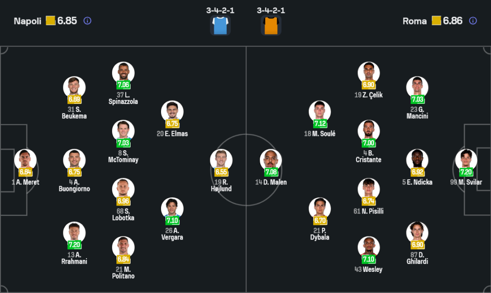 นาโปลีของคอนเต้ยังคงเน้นระบบสามเซ็นเตอร์แบ็ก 3-4-2-1 เหมือนเดิม โดยเกมนี้คาดว่าจะให้ อเล็กซ์ เมเร็ท ลงเฝ้าเสา แผงหลังสามคนประกอบด้วย สเตฟาน เบวเคม่า, อเลสซานโดร บวนจอร์โน่ และ อามีร์ ราห์มานี่ คอยตัดเกมรุกของทีมเยือนให้ได้ตั้งแต่หน้าเขตโทษ ส่วนวิงแบ็กขวาใช้ มัตเตโอ โปลิตาโน่ ที่จุดประกายเกมรุกได้ดีทั้งการลากเลื้อยและเปิดบอล ขณะที่ฝั่งซ้ายฝากความหวังไว้กับ เลโอนาร์โด สปินาซโซล่า อดีตแข้งโรม่า ที่พร้อมเล่นงานทีมเก่า
