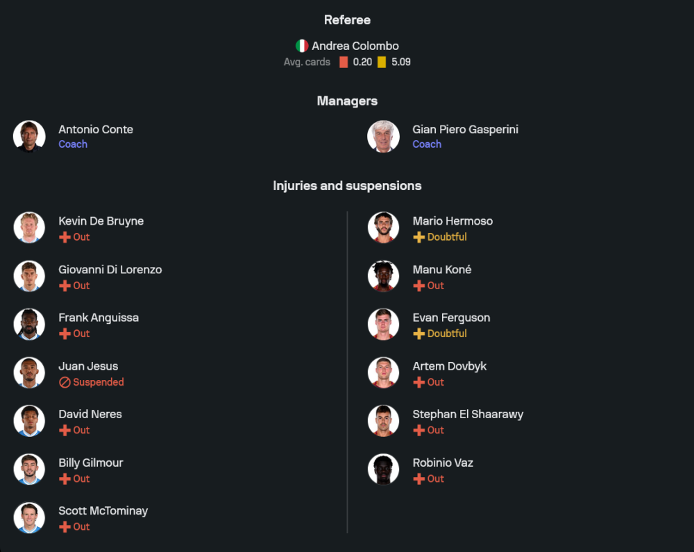 เมื่อทั้งสองทีมยืนระบบ 3-4-2-1 เหมือนกัน เกมคืนนี้มีโอกาสสูงจะเป็นการชิงจังหวะระหว่างสองกุนซือที่จัดว่าแท็กติกจัดจ้าน ทั้งคอนเต้และกาสเปรินี่ต่างเน้นวินัยเกมรับและการขึ้นเกมจากวิงแบ็กเป็นหลัก หากนาโปลีครองบอลบุกใส่ตามสไตล์ คีย์แมนจะอยู่ที่การเคลื่อนที่ของ ฮอยลุนด์ ในกรอบเขตโทษ ผสมกับการสอดแฝงของ เวร์การ่า และ เอลมาส ที่พร้อมสับไกจากแถวสอง รวมถึงลูกเปิดจาก สปินาซโซล่า และ โปลิตาโน่ ที่มักสร้างความปั่นป่วนริมเส้น