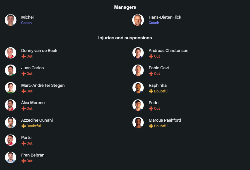 มิเชลต้องปวดหัวกับลิสต์ตัวเจ็บที่ยาวเป็นหางว่าว เริ่มตั้งแต่ ดอนนี่ ฟาน เดอ เบ็ค, ฆวน การ์ลอส, มาร์ค อันเดร แทร์ ชเตเก้น, อเล็กซ์ โมเรโน่ และ ปอร์ตู ที่ชวดลงสนามแน่นอน ขณะที่ อัซเซดีน อูนาฮี ยังต้องเช็กความฟิตจนนาทีสุดท้าย แม้จะมีชื่อเป็นตัวสำรองในบางเกมก็ตาม