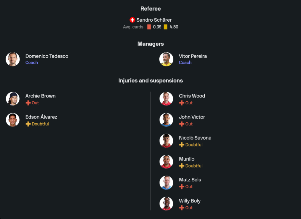 ทีมเยือนของ วิตอร์ เปไรร่า เจอปัญหาตัวเจ็บและตัวไม่พร้อมหลายตำแหน่ง โดยมีรายที่ถูกระบุว่า “หมดสิทธิ์” ได้แก่ คริส วู้ด, จอห์น วิกตอร์, มัตซ์ เซลส์ และ วิลลี่ โบลี่ แถมยังมีรายที่ขึ้นสถานะต้องเช็กอย่าง นิโคโล่ ซาโวน่า และ มูริลโล่ ทำให้การจัดทัพต้องคุมความเสี่ยงให้ดี ผังที่เห็นชัดคือ 4-2-3-1 วางโครงสร้างรับให้มีวินัย แล้วหวังจังหวะสวนกลับจากตัวรุกที่สปีดดี การมาเยือนสนามที่บรรยากาศเดือดแบบนี้ ฟอเรสต์ต้องเอา “ความนิ่ง” มาชน “ความโหม” ไม่อย่างนั้นมีสิทธิ์โดนบีบจนเสียรูปเกม
