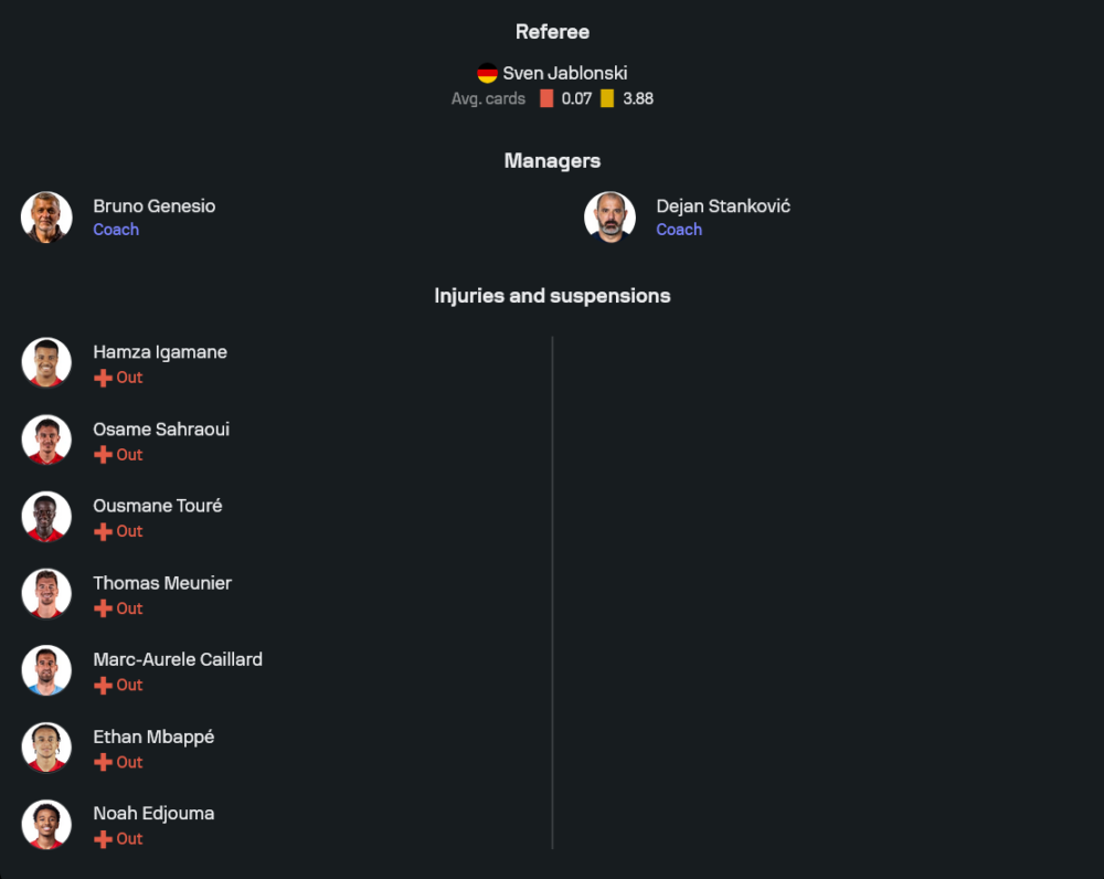 ลีลล์ของบรูโน่ เจเนซิโอ ต้องรับมือกับปัญหาความต่อเนื่องในลีกที่สะดุดหนัก ช่วงหลังพวกเขาทำแต้มหล่นต่อเนื่องในเกมลีกเอิงหลายแมตช์ติด และชัยชนะเหนือไฟร์บวร์กคือหนึ่งในโมเมนตัมเชิงบวกที่ช่วยประคองอารมณ์ทีมก่อนเข้าสู่น็อกเอาต์ ข่าวร้ายคือรายชื่อเจ็บและสภาพไม่สมบูรณ์ยาวเป็นหางว่าว ไม่ว่าจะเป็น ฮัมซ่า อิกามาน, โอซาม ซาห์ราอุย, อุสมาน ตูเร่, โธมัส เมอนิเยร์, มาร์ก-โอเรล กายาร์, อีธาน เอ็มบัปเป้ และ โนอาห์ เอดชูม่า ทำให้การโรเตชั่นแทบไม่มีพื้นที่ให้ลองผิดลองถูก