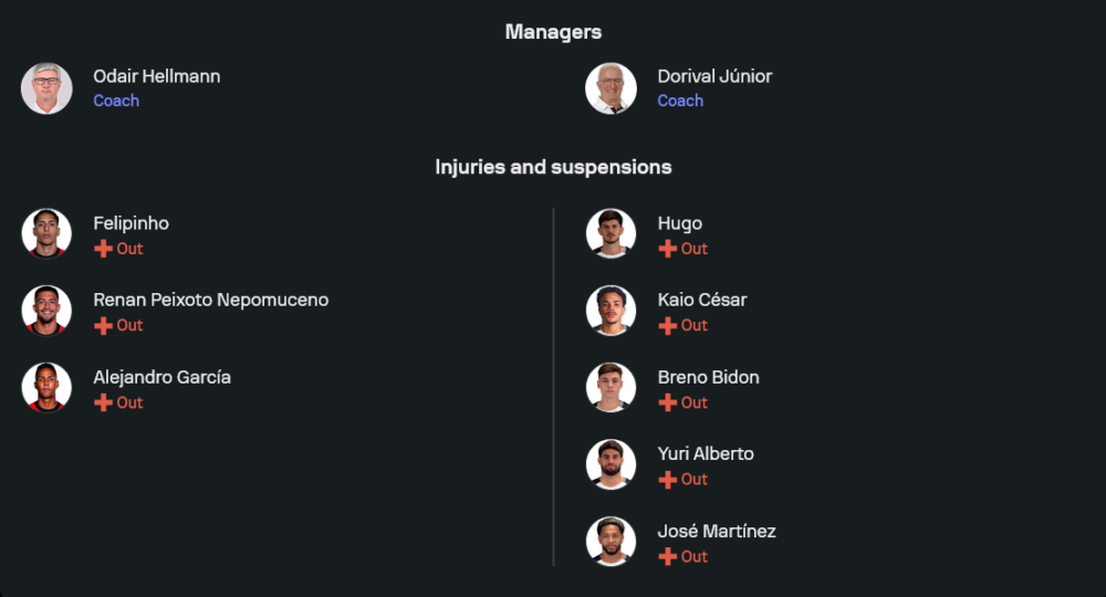 ส่วนรายชื่อเจ็บ/ไม่พร้อมใช้งานของฝั่งนี้มี เฟลิพินโญ่, เรนาน เปโชโต้ เนโปมูเซโน่ และ อเลฮานโดร การ์เซีย ทำให้ตัวเลือกหมุนเวียนบางตำแหน่งลดลงพอสมควร
