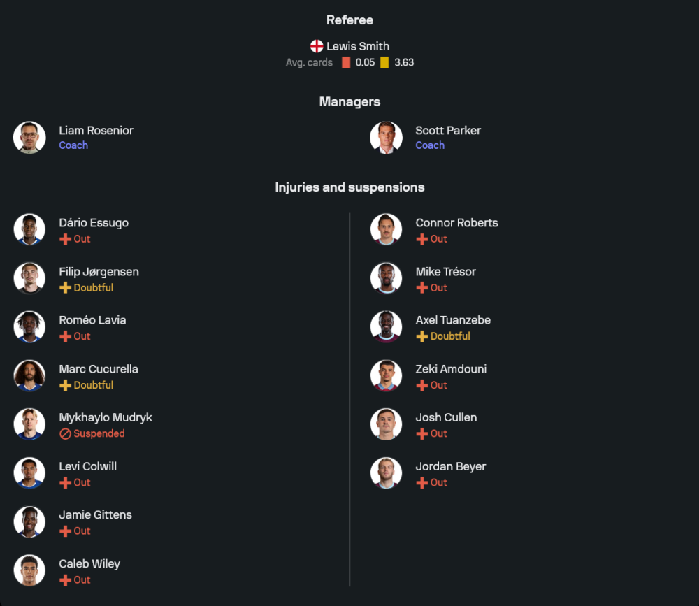 เชลซีของเลียม โรซีเนียร์ยังมีตัวเจ็บสะสมอยู่พอสมควร ทั้ง เลวี่ โคลวิลล์, คาเล็บ ไวลี่ย์, โรเมโอ ลาเวีย และ เจมี่ กิตเท่นส์ ขณะที่มีจุดให้เช็กความฟิต/ความพร้อมเพิ่มจากรายชื่อที่ไม่สมบูรณ์เต็มร้อยอย่าง ฟิลิป ยอร์เกนเซ่น และ มาร์ก กูกูเรญ่า แถมมีกรณีพักแข้งจากโทษแบนอย่าง มิไคโล มูดริก อีกหนึ่งตัวเลือกเกมรุกริมเส้น