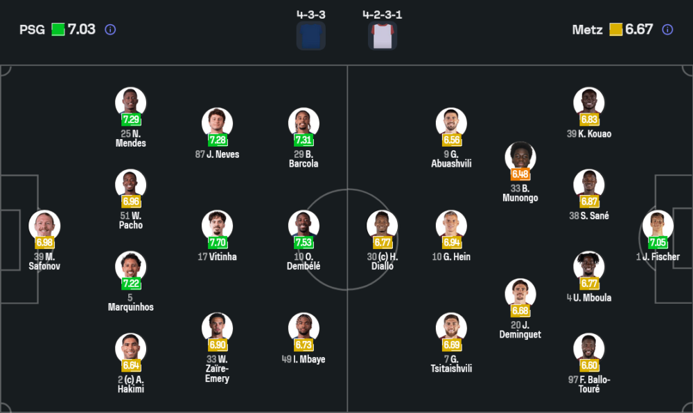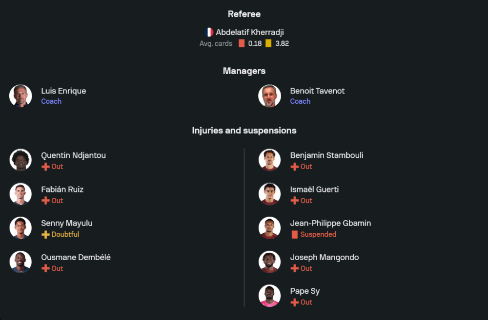ประเด็นสำคัญคือรายชื่อผู้เล่นไม่พร้อมใช้งานมีทั้ง เควนติน เอ็นดจานตู และ ฟาเบียน รุยซ์ ที่ถูกระบุว่าไม่พร้อม รวมถึง เซนนี มายูลู สถานะยังน่าห่วง ขณะเดียวกันชื่อของเดมเบเลถูกใส่สถานะเจ็บ แต่ยังถูกวางอยู่ในไลน์อัพคาดการณ์ นี่คือจุดที่ทำให้เกมรุกปารีสมี “เงื่อนไข” ว่าจะได้ลงเต็มถังแค่ไหน แต่ไม่ว่าคนไหนลง เป้าหมายเดียวคือกดดันให้เม็ตซ์เสียทรงตั้งแต่นาทีแรก