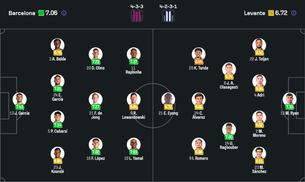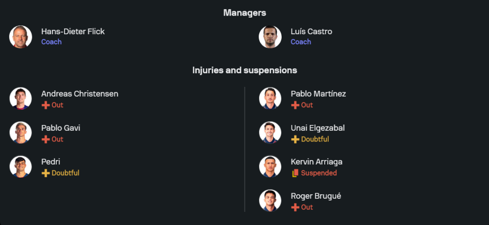 เจ้าบ้านยังมีตัวเดี้ยงค้างเดิมอย่าง อันเดรียส คริสเตนเซ่น และ กาบี ที่หมดสิทธิ์ช่วยทีมแน่นอน ส่วน เปดรี้ อยู่ในสถานะต้องเช็กความฟิตและมีโอกาสสูงที่จะไม่พร้อมสำหรับการออกสตาร์ทเต็มรูปแบบ แต่แกนหลักที่เหลือถือว่าพร้อมรบ โดยโครงสร้างทีมสามารถยืนพื้นระบบ 4-2-3-1 ตามที่ถนัด หรือปรับไหลเป็น 4-3-3 ตามทรงการจัดตำแหน่งในสนามได้ จุดสำคัญคือแดนกลางยังต้องฝากความนิ่งไว้กับ เฟรงกี้ เดอ ยอง แล้วให้สามตัวรุกอย่าง ราฟินญ่า, ดานี่ โอลโม่ และ ลามีน ยามาล คอยปั่นเกมด้านหลัง โรเบิร์ต เลวานดอฟสกี้ ที่เป็นหัวหอกตัวจบสกอร์