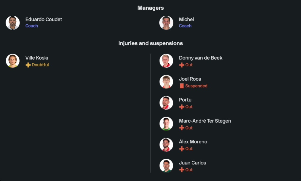 ทีมเยือนของ มิเชล ยังเจอปัญหาเดิมคือขาดตัวหลักหลายราย โดยมีทั้งกลุ่มที่เจ็บยาวและคนที่ไม่พร้อมใช้งาน ส่งผลให้การหมุนเวียนอาจไม่ลื่นเท่าไหร่ ที่กระทบชัดคือแดนกลาง เพราะมีผู้เล่นติดโทษแบนอย่าง โจเอล โรก้า และกลุ่มที่ยังไม่พร้อมอย่าง ดอนนี่ ฟาน เดอ เบค รวมถึง ปอร์ตู ขณะที่แนวรับก็มีตัวเจ็บอย่าง อเล็กซ์ โมเรโน่ ส่วนตำแหน่งผู้รักษาประตูก็มีรายชื่อที่ไม่พร้อมเช่นกัน อย่างไรก็ตาม โครงสร้างหลักยังน่าจะยึด 4-2-3-1 ใช้ โธมัส เลอมาร์ เป็นตัวเชื่อมเกมรุกหลังหน้าเป้า วลาดิสลาฟ วานัต และมี วิกเตอร์ ซีกานคอฟ กับ ออสการ์ จิล เป็นตัวสร้างจังหวะทางด้านข้าง จุดแข็งของจีโรน่าคือความนิ่งในการยืนตำแหน่ง และการเลือกจังหวะเล่นที่ไม่ผลีผลาม แม้ตัวไม่ครบแต่ยัง “เหนียว” ได้เสมอ