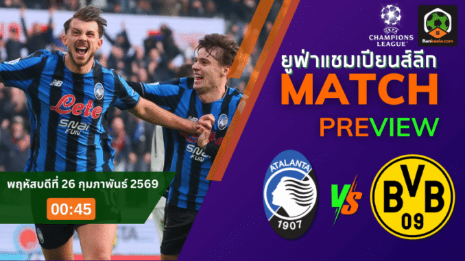 ศึก ยูฟ่า แชมเปี้ยนส์ ลีก รอบเพลย์ออฟ นัดที่ 2 คืนวันพฤหัสบดีที่ 26 กุมภาพันธ์ 2569 เวลา 00:45 น. อตาลันต้าเตรียมกลับมาเล่นในบ้านที่นิว บาลานซ์ อารีน่า พร้อมภารกิจหนักระดับ “ต้องชนะให้ขาด” หลังเลกแรกบุกไปพลาดท่าแพ้ดอร์ทมุนด์ 0-2 เกมนี้บรรยากาศมันส์แน่ เพราะเจ้าถิ่นไม่มีทางเลือก ต้องเร่งจังหวะตั้งแต่นาทีแรกเพื่อทวงความได้เปรียบคืน ขณะที่ทีมเยือนแค่ยืนให้มั่น อ่านเกมให้ขาด แล้วคอยสวนให้คมก็มีสิทธิ์ปิดประตูใส่เจ้าบ้านได้เลย เรตเปิดมาที่ ราคาบอลวันนี้ อตาลันต้า ต่อ ปป (0.25) ซึ่งสะท้อนว่าเจ้าบ้านได้แรงหนุนจากสนามและแรงฮึด แต่ความจริงในสนามคือดอร์ทมุนด์ถือไพ่เหนือกว่า 2 ประตูเต็มๆ ใครตาม ตารางบอลวันนี้ คู่นี้บอกเลยห้ามกระพริบตา เพราะมันคือเกมที่ทุกการตัดสินใจจะมีราคาเท่าฤดูกาลทั้งซีซั่น