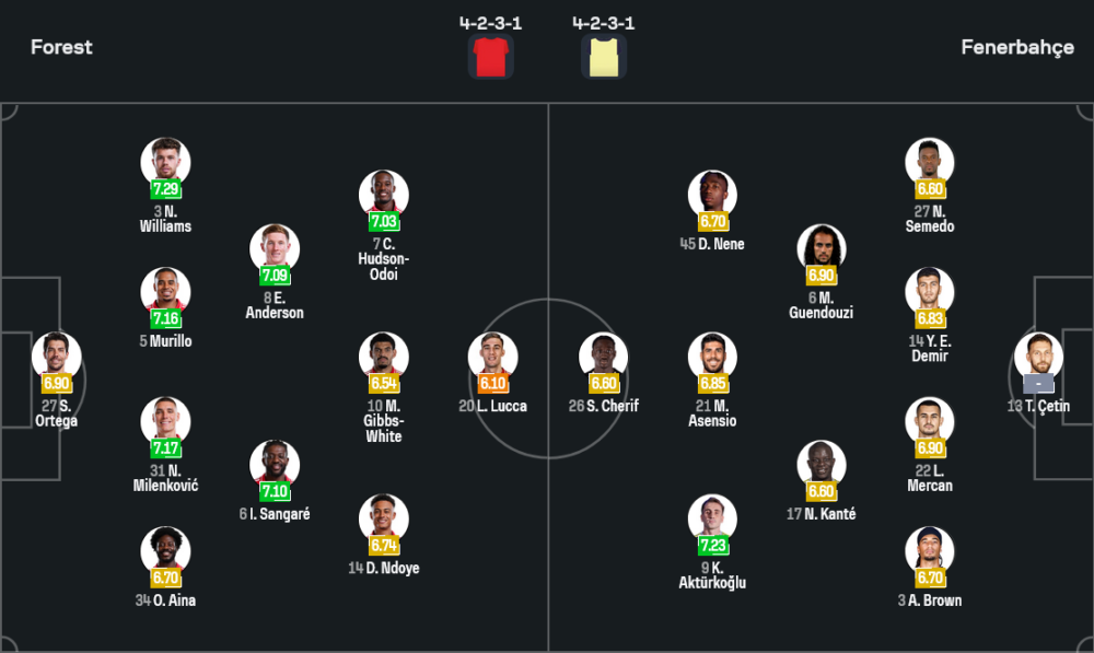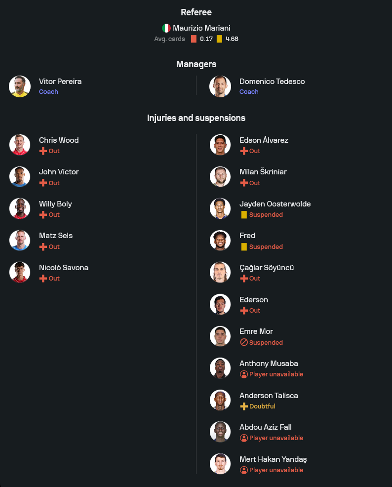 ลูกทีมของวิตอร์ เปไรร่ากลับมาเล่นในบ้านด้วยสภาพขุมกำลังที่ค่อนข้างสมบูรณ์ ตัวเจ็บยาวยังเป็นหน้าเดิมอย่าง คริส วู้ด, วิลลี่ โบลี่, นิโคโล่ ซาโวน่า, จอห์น วิกตอร์ และ มัตซ์ เซลส์ ที่ยังไม่พร้อมลงสนาม แต่โครงหลักชุดถล่มเฟเนร์ฯ เลกแรกอยู่กันครบ ระบบที่ใช้คือ 4-2-3-1 ผู้รักษาประตูเป็น สเตฟาน ออร์เตก้า แผงแบ็กโฟร์มี โอล่า ไอน่า ยืนฝั่งขวา คู่เซ็นเตอร์เป็น นิโคล่า มิเลนโควิช จับคู่ มูริลโล่ ส่วนแบ็กซ้ายใช้ นีโก้ วิลเลี่ยมส์ ด่านกลางคู่รับส่งบอลประกอบด้วย อิบราฮิม ซ็องกาเร่ จับคู่กับ ดาวิด เอ็นดอย ที่วิ่งไล่บดไม่หยุด แถวสองวาง คัลลั่ม ฮัดสัน โอดอย ยืนด้านซ้าย มอร์แกน กิ๊บบ์ส ไวท์ รับบทจอมทัพตัวกลาง และ โอมารี่ ฮัตชินสัน เติมเกมรุกทางขวา หน้าเป้าใช้ อิกอร์ เฮซุส ที่กำลังคมจัดคืออาวุธหลักในการจบสกอร์