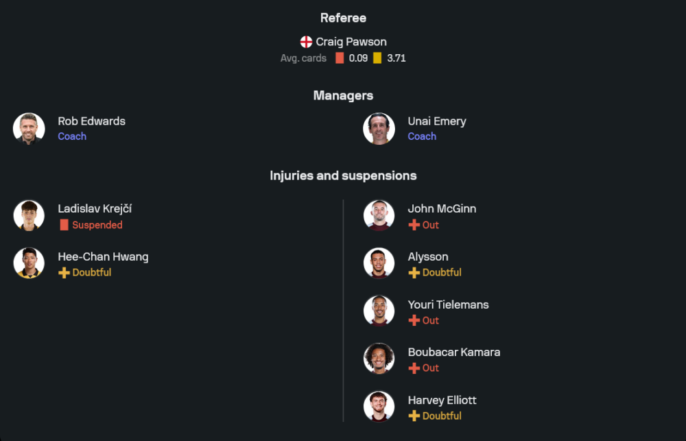 ทีมเยือนภายใต้การคุมทีมของ อูไน เอเมรี่ ยังขาดตัวหลักหลายคนเช่นกัน ทั้ง บูบาก้าร์ กามาร่า, จอห์น แม็กกินน์ และ ยูรี่ ตีเลอม็องส์ ที่ยังอยู่ในช่วงรักษาอาการบาดเจ็บ นอกจากนี้ยังต้องเช็กสภาพร่างกายของกองหน้าอย่าง อลิสซอน รวมถึงดาวรุ่งอย่าง ฮาร์วีย์ เอลเลียตต์ ที่ยังไม่ฟิตเต็มร้อย แต่ด้วยขุมกำลังที่ลึกกว่าเจ้าบ้าน ทำให้โครงสร้างทีมยังดูแน่นและสมดุล