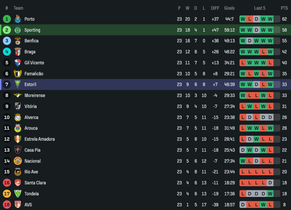 สถานการณ์ก่อนลงสนาม ปอร์โต้นำโด่งอยู่บนจ่าฝูง และมีคิวเตะก่อน หากเก็บสามแต้มได้ช่องว่างจะเพิ่มทันที ทำให้สปอร์ติ้งจำเป็นต้องชนะเพื่อตามกดดันต่อไป ส่วนฝั่งทีมเยือนอย่าง เอสโตริล ตอนนี้รั้งอันดับ 7 ของตาราง ห่างท็อปโฟร์ 9 แต้ม และตามอันดับห้าอย่างกิล วิเซนเต้ 7 แต้ม เกมนี้จึงเป็นโอกาสทองที่จะพิสูจน์ว่าพวกเขาพร้อมแทรกขึ้นมาลุ้นตั๋วยุโรปเต็มตัวหรือไม่