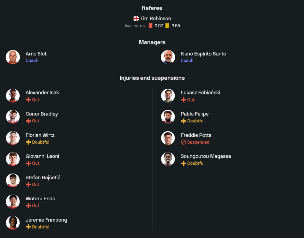 ลิเวอร์พูลของ อาร์เน่ สล็อต ยังต้องลุ้นเช็กฟิต ฟลอเรียน เวียร์ตซ์ จอมทัพตัวสร้างสรรค์เกมที่กลับมาซ้อมได้แล้ว แต่ยังไม่เต็มร้อย ส่วนแข้งเดี้ยงยาวกลุ่มเดิมทั้ง สเตฟาน บายเซติช, วาตารุ เอ็นโด, คอเนอร์ แบร็ดลี่ย์, เจเรมี่ ฟริมปง, อเล็กซานเดอร์ อิซัค และโจวานนี่ เลโอนี่ ยังไม่พร้อมคืนสนาม แกนหลักที่เหลือพร้อมลุย ระบบที่คาดคือ 4-2-3-1 ใช้ อลิสซง ยืนเฝ้าเสา แผงหลังประกอบด้วย โจ โกเมซ, อิบราฮิม่า โกนาเต้, เฟอร์กิล ฟาน ไดย์ค และ มิลอส เคอร์เคซ กลางคู่เป็น ไรอัน กราเวนเบิร์ช จับคู่ อเล็กซิส แม็ก อัลลิสเตอร์ สามตัวรุกวาง โมฮาเหม็ด ซาล่าห์, โดมินิค โซโบสไล, โคดี้ กั๊คโป ป้อนบอลให้หัวหอกตัวเป้า อูโก้ เอกิติเก้ ที่เริ่มจูนกับเพื่อนร่วมทีมได้ดีขึ้นเรื่อยๆ