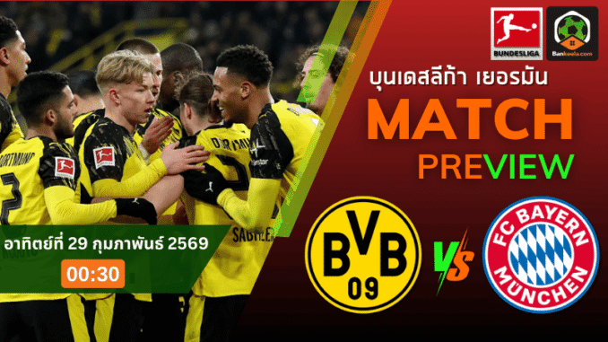 ศึกใหญ่ของเวที บุนเดสลีกา คืนวันอาทิตย์นี้มาพร้อมกลิ่นไอเพลิงเดือด เมื่อรองจ่าฝูงอย่าง โบรุสเซีย ดอร์ทมุนด์ เตรียมเปิดนรกที่ซิกนัล อิดูน่า พาร์ค ต้อนรับการบุกมาเยือนของจ่าฝูงตัวจริงเสียงจริงอย่าง บาเยิร์น มิวนิค แข่งขันคืนวันอาทิตย์ที่ 29 กุมภาพันธ์ 2569 เวลา 00.30 น. เกมนี้ไม่ใช่แค่ศักดิ์ศรีแดร์ คลาสสิกเกอร์ แต่ยังเป็นแมตช์ที่อาจเปลี่ยนสมดุลลุ้นแชมป์ของฤดูกาล