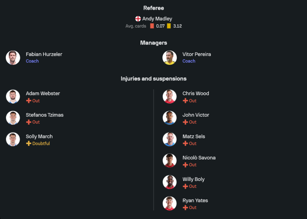 ไบรท์ตันของ ฟาเบียน ฮูร์เซเลอร์ ยังมีปัญหาตัวเจ็บกวนใจพอสมควร กลุ่มที่ไม่พร้อมลงมีทั้ง ยาซิน อายารี่, สเตฟานอส ซิมาส, อดัม เว็บสเตอร์ รวมถึง โซโลม่อน มาร์ช ที่สถานะยังไม่นิ่ง ทำให้การโรเตชันบางตำแหน่งต้องคิดหนัก แต่ภาพรวมยังพอวางแกนหลักได้ครบ แนวรุกคาดว่าจะใช้สามประสาน ดิเอโก้ โกเมซ, แดนนี่ เวลเบ็ค และ คาโอรุ มิโตมะ ที่พร้อมใช้ความเร็วกับการเข้าทำเล่นงานแนวรับทีมเยือน ขณะที่แดนกลางวาง การ์ลอส บาเลบา เป็นคนคุมจังหวะให้เกมเดินตามแผน
