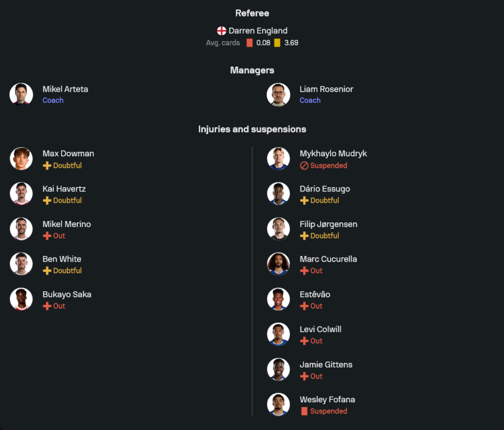 มิเกล อาร์เตต้า เจองานจัดตัวไม่ง่าย เพราะมีรายชื่อเจ็บและสภาพไม่สมบูรณ์หลายคน ได้แก่ แม็กซ์ ดาวแมน, มิเกล เมริโน่ (เจ็บ), ไค ฮาแวร์ตซ์ (ไม่พร้อม), เบ็น ไวท์ (ไม่พร้อม) และ บูกาโย่ ซาก้า (ไม่พร้อม) ทำให้การเลือกชุดตัวจริงต้องเน้นสมดุลมากกว่าความหวือหวา แนวทางวางหมากภาพรวมยังยึดระบบ 4-2-3-1 ที่คุมจังหวะกลางสนามแน่นและเร่งเกมจากริมเส้นได้ โดยแกนหลักที่น่าจับตาคือ ดาบิด ราย่า เฝ้าเสา แนวรับมี ซาลิบา กับ กาเบรียล คุมพื้นที่ ขยับขึ้นมาแดนกลางมี ดีแคลน ไรซ์ เป็นตัวชนและตัวคุมจังหวะ พร้อมตัวรุกที่พร้อมปะทุอย่าง ทรอสซาร์ และ เอเซ่ ที่มีบทบาทสร้างความแตกต่างในพื้นที่สุดท้าย