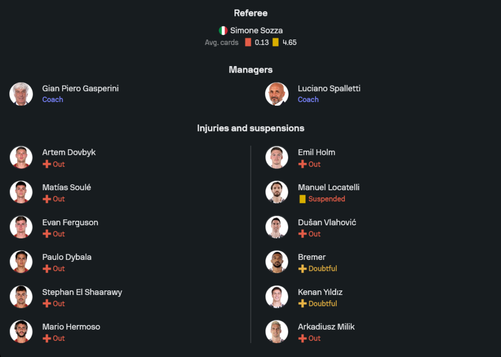 ฝั่งยูเวนตุสของ ลูชาโน่ สปัลเล็ตติ เพิ่งผ่านเกมยุโรปที่ใช้พลังงานมหาศาลมา แถมสภาพทีมก็มีทั้งเจ็บและแบน เกมนี้ไม่มี ดูซาน วลาโฮวิช ที่เดี้ยงยาว และยังต้องรอเช็กบางรายในแนวรับ โดยมีข่าวดีคือ เกลซอน เบรเม่ร์ มีลุ้นคืนสนาม เช่นเดียวกับ ปิแอร์ กาลูลู ที่พร้อมกลับมาช่วยทีม แต่ปัญหาใหญ่คือการเสีย มานูเอล โลคาเตลลี่ จากโทษแบน ทำให้แดนกลางซึ่งเป็นหัวใจของระบบ 3-4-2-1 ต้องมีการปรับสมดุลใหม่ โจทย์ของม้าลายคือ “อย่าเสียทรงเร็ว” เพราะถ้าโดนโรม่าไล่บดตั้งแต่ต้น เกมอาจไหลไปทางเจ้าบ้านแบบดึงกลับยาก