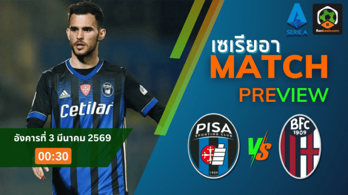 ศึกกัลโช่ เซเรีย อา คืนวันอังคารที่ 3 มีนาคม 2569 เวลา 00:30 น. สนามของปิซ่ากำลังจะกลายเป็นเวทีพิสูจน์ความต่างของ “ทีมหนีตกชั้น” กับ “ทีมที่เริ่มเข้าที่เข้าทาง” แบบชัดเจน เพราะฝั่งเจ้าถิ่นกำลังจมอยู่กับความกดดัน ผลงานไม่ชนะในลีกต่อเนื่องยาว ๆ จนแต้มเริ่มขาดจากโซนปลอดภัย ขณะที่ผู้มาเยือนอย่างโบโลญญ่าเครื่องติดสุด ๆ ทั้งในลีกและบอลยุโรป ชนะเป็นว่าเล่นจนความมั่นใจกลับมาเต็มถัง