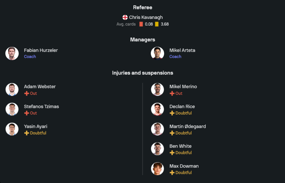 ไบรท์ตันภายใต้การคุมทีมของฟาเบียน ฮูร์เซเลอร์ ยังมีประเด็นสภาพทีมที่ต้องเช็กหลายจุด กลุ่มที่ไม่พร้อมลงสนามคือ อดัม เว็บสเตอร์ และสเตฟานอส ซิมาส ขณะที่ ยาซิน อายารี มีสถานะต้องลุ้นความฟิต ซึ่งส่งผลต่อทางเลือกในแดนกลางและการเพรสซิ่งของทีมพอสมควร ภาพรวมคาดว่าเจ้าบ้านจะยืนระบบ 4-2-3-1 เพื่อให้เกมรับแน่นขึ้นและมีตัวเชื่อมเกมรุกชัดเจน โดยแกนหลักที่น่าจับตาคือ บาร์ต แฟร์บรู้กเก้น ในด่านสุดท้าย แผงหลังที่มีลูอิส ดังค์คุมจังหวะ และโซนรุกที่ยังฝากความหวังกับ คาโอรุ มิโตมะ รวมถึง แดนนี่ เวลเบ็ค ที่พร้อมเล่นงานพื้นที่ว่างเมื่อได้โอกาส