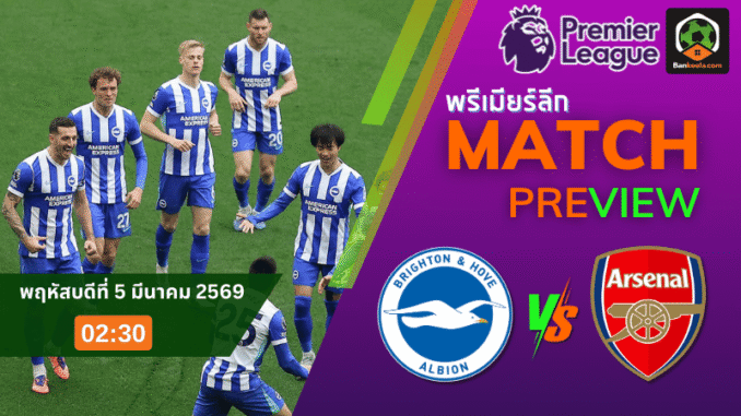 ศึกพรีเมียร์ลีก อังกฤษ คืนวันพฤหัสบดีที่ 5 มีนาคม 2569 เวลา 02:30 น. ไบรท์ตัน ทีมอันดับ 11 เตรียมเปิดบ้านที่เอเม็กซ์ สเตเดี้ยม รับการมาเยือนของอาร์เซนอล จ่าฝูงอันดับ 1 ที่กำลังเดินเครื่องล่าชัยแบบไม่เผื่อใจใคร เกมนี้เป็นแมตช์ที่จังหวะจะเร็ว บู๊จะหนัก และความเฉียบจะชี้เป็นชี้ตาย เพราะเจ้าถิ่นกำลังพยายามยื้อพื้นที่กลางตารางให้มั่นคง ขณะที่ทีมเยือนต้องการอีก 3 แต้มเพื่อรักษาความได้เปรียบในการไล่ล่าความสำเร็จในช่วงโค้งสุดท้ายของซีซั่น แถมเรต ราคาบอลวันนี้ เปิดมาให้อาร์เซนอลบุกต่อ 0.75 ทำให้ภาพรวมเกมนี้ชัดเลยว่า “ปืนใหญ่” ถูกยกให้เหนือกว่า แต่ความจริงในสนามยังต้องวัดกันที่ความแน่นของเกมรับ การเปลี่ยนจังหวะจากรับเป็นรุก และความนิ่งในพื้นที่สุดท้าย ใครกำลังไล่เช็ก ตารางบอลวันนี้ บอกเลยคู่นี้คือหนึ่งในเกมที่ควรปักหมุดไว้ก่อนคู่อื่น