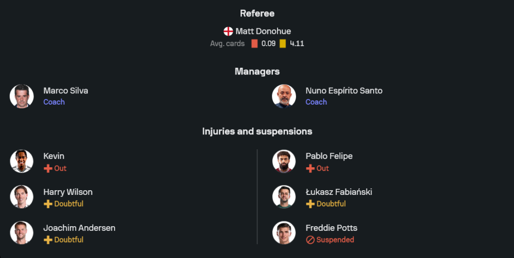 มาร์โก ซิลวาเตรียมวางหมาก 4-2-3-1 เน้นคุมจังหวะกลางสนามแล้วเร่งสปีดเข้าพื้นที่สุดท้าย จุดเด่นคือการต่อบอลขึ้นเกมที่มีแบบแผน และการเติมจากริมเส้นที่ทำให้แนวรับคู่แข่งหลุดตำแหน่งได้ง่าย ความกังวลคือสภาพขุมกำลังบางจุด โดยรายชื่อที่ไม่สมบูรณ์มี เควิน (เจ็บหมดสิทธิ์) ส่วน แฮร์รี่ วิลสัน และ โยอาคิม แอนเดอร์เซน อยู่ในสถานะต้องเช็กความฟิต แต่แกนหลักที่เหลือยังพร้อมนำเกม นำโดย แบร์นด์ เลโน่ เฝ้าเสา แนวรับมี เตเต้, ดิย็อป, บาสซี่ย์ และ เซสเซญง แดนกลางใช้ เบอร์เก้ คุมจังหวะคู่กับ อิโวบี้ ส่วนสามตัวรุกหลังหน้าเป้าจัด สมิธ โรว์, ออสการ์ บ๊อบบ์ และริมเส้นอย่าง ชุควูเอเซ่ ปั้นเกมให้ ราอูล ฆิเมเนซ ล่าตาข่าย