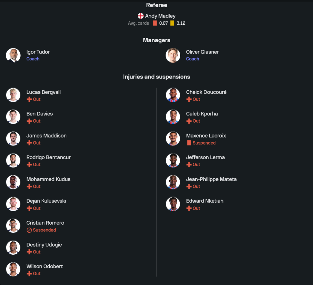 สเปอร์สของ อิกอร์ ตูดอร์ เจองานหนักตรง “ตัวหาย” เพราะมีทั้งเจ็บทั้งแบนกองเต็มแผง โดยเกมนี้ยังไร้ คริสเตียน โรเมโร่ ที่ติดโทษแบนเป็นนัดสุดท้าย แถมกลุ่มเดี้ยงหน้าเดิมยังไม่กลับมาอีกยก ไม่ว่าจะเป็น โรดริโก้ เบนตานกูร์, ลูคัส เบิร์กวัลล์, เบ็น เดวี่ส์, โมฮัมเหม็ด คูดุส, เดยาน คูลูเซฟสกี้, เจมส์ แม็ดดิสัน, วิลซง โอโดแบร์ และ เดสตินี้ อูโดกี้ ทำให้การจัดทัพแทบต้อง “ปะผุ” กันหลายตำแหน่ง แต่ทรงของตูดอร์ยังชัดว่าจะยืนระบบ 4-2-3-1 เพื่อให้เกมรุกมีสองหัวหอกค้ำหน้าแล้วบีบเกมให้เร็วขึ้น แนวคิดคือเล่นให้ดุดันขึ้น แต่ปัญหาคือความแน่นในเกมรับยังไม่น่าไว้ใจ