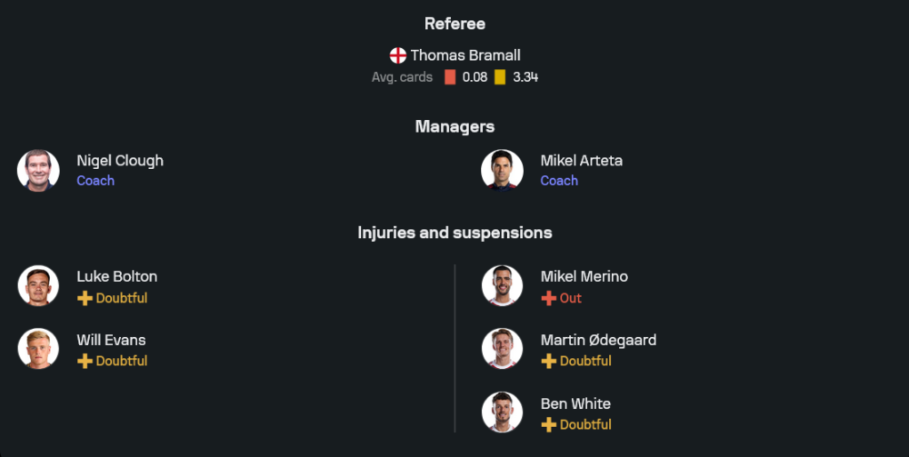 สภาพทีมฝั่งปืนใหญ่ยังมีจุดให้ลุ้นเรื่องความฟิต มิเกล เมริโน่ หมดสิทธิ์ลงแน่นอน ขณะที่ มาร์ติน โอเดการ์ด และ เบน ไวท์ ยังอยู่ในสถานะต้องเช็กก่อนเกม ถ้าสองรายนี้ไม่ไหว การคุมจังหวะและเกมริมเส้นบางฝั่งอาจต้องสลับบทบาทกันพอสมควร
