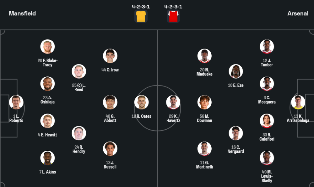เช่นกัน แต่เป็นเวอร์ชันที่บุกกดได้ทั้งเกม คุณภาพผู้เล่นชัดเจนตั้งแต่หลังบ้าน เกปา อาร์ริซาบาลาก้า เฝ้าเสา แผงรับมี ยูเรียน ทิมเบอร์, คริสเตียน มอสเกอร่า, ริคคาร์โด้ คาลาฟิออรี่ และดาวรุ่ง ไมลส์ ลูอิส-สเคลลี่ แดนกลางใช้ คริสเตียน นอร์การ์ด คุมจังหวะ ข้างหน้ามีตัวป่วนอย่าง เอเบเรชี่ เอเซ่ ปั้นเกมให้ โนนี่ มาดูเอเก้, ไค ฮาแวร์ตซ์, และ กาเบรียล มาร์ติเนลลี่ โดยมีดาวรุ่ง มักซ์ ดาวแมน เติมความสดในแดนบน