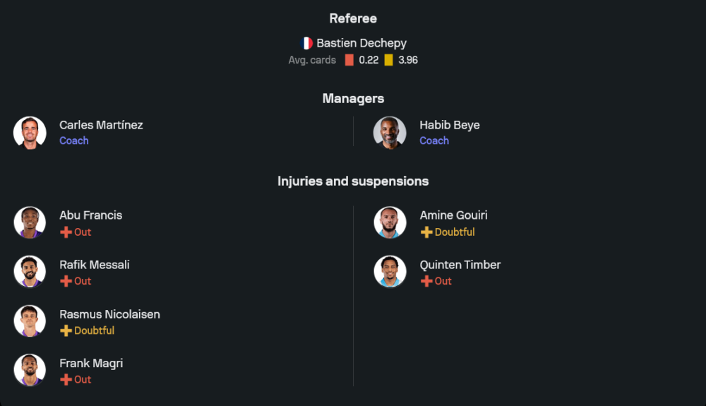 ฝั่งทีมเยือนมีรายที่ต้องลุ้นความพร้อมอย่าง อามีน กูอิรี่ ขณะที่ ควินเทน ทิมเบอร์ ไม่พร้อมลงช่วยแน่นอน จุดน่าสนใจคือทีมนี้ครองบอลสูงกว่าชัดเจน และมีตัวรุกที่พร้อมเปลี่ยนเกมด้วยคุณภาพเฉพาะตัว แต่ก็มีช่วงหลุดสมาธิในเกมรับให้เห็นเป็นระยะ โดยเฉพาะเมื่อเสียประตูแรก