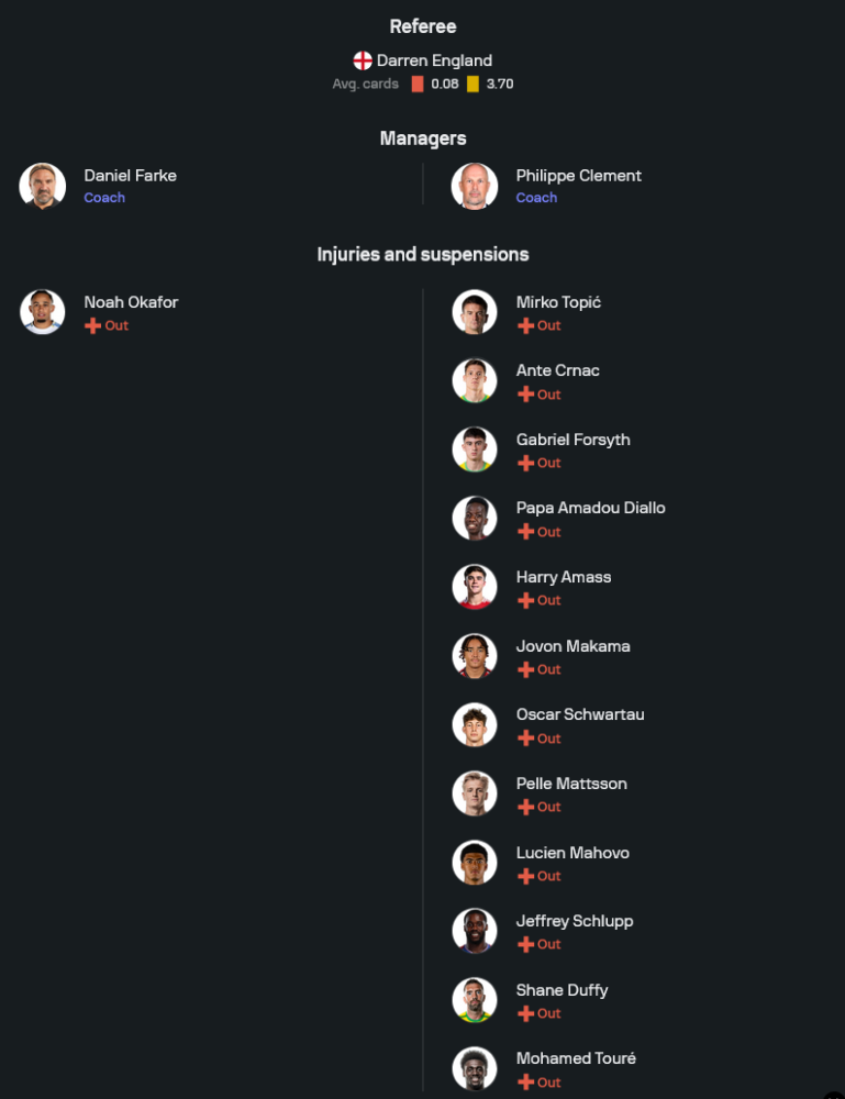 เรื่องสภาพทีมยังมีข่าวร้ายคือ โนอาห์ โอคาฟอร์ เจ็บแฮมสตริงหมดสิทธิ์ช่วยทีม ทำให้ทางเลือกแนวรุกบางลง แต่ตัวใช้งานในเกมรุกยังมีให้ปรับ ทั้งแดน เจมส์ และวิลฟรีด ญอนโต ที่พร้อมลุยเพื่อแย่งตัวจริง เกมนี้ลีดส์ต้องเล่นแบบไม่ปล่อยให้อารมณ์เสียจากนัดก่อน ๆ มาตามหลอก เพราะบอลถ้วยไม่รอใคร