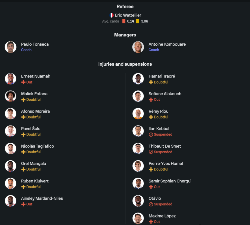 สภาพทีมยังมีตัวเจ็บตัวแบนปะปน เช่น โซฟิยาน อลากูช, ซามีร์ แชร์กี, มักซิเม่ โลเปซ ลงไม่ได้ ขณะที่ อิลาน เคบบัล, ติโบต์ เดอ สเมต และ โอตาวิโอ ติดโทษแบน รวมถึงบางรายยังต้องเช็กความพร้อมอย่าง ฮามารี ตราโอเร่, เรมี รีอู และ ปิแอร์ อีฟ อาเมล