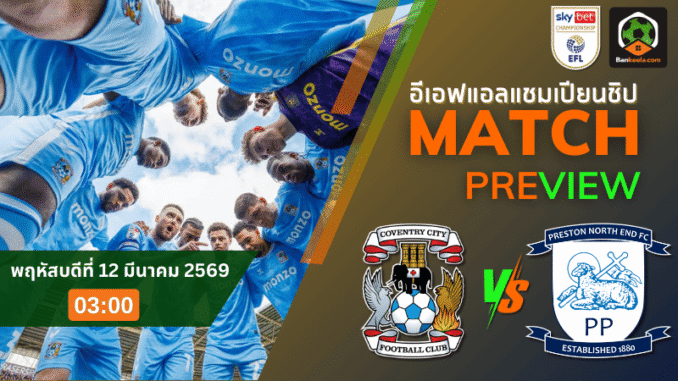 ศึกแชมเปี้ยนชิพ อังกฤษ คืนวันพฤหัสบดีที่ 12 มีนาคม 2569 เวลา 03:00 น. โคเวนทรี ซิตี้ เตรียมเปิดสนามโคเวนทรี บิลดิ้ง โซไซตี้ อารีน่า รับมือ เปรสตัน นอร์ธเอนด์ โดยภาพรวมเกมนี้เจ้าถิ่นดูเหนือกว่าชัดเจน ทั้งเรื่องฟอร์ม ความมั่นใจ และประสิทธิภาพในเกมรุก ช่วงหลังโคเวนทรีกำลังเล่นอย่างดุดัน เดินหน้าเก็บชัยต่อเนื่องแบบไม่สะดุด ต่างจากเปรสตันที่ผลงานแผ่วลงอย่างน่าเป็นห่วง เกมรับเสียทรงง่ายและเกมรุกก็ไม่คมพอจะกู้สถานการณ์กลับมาได้