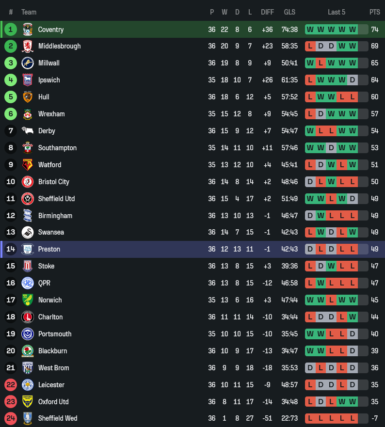 เปรสตันสวนทางชัดเจน 5 นัดหลังสุดไม่ชนะใครเลย แพ้ อ็อกซ์ฟอร์ด 1-3, แพ้ มิลล์วอลล์ 0-2, เสมอ สวอนซี 1-1, แพ้ แบล็คเบิร์น 0-1 และเสมอ วัตฟอร์ด 2-2 ปัญหาคือเกมรับเสียประตูง่าย ขณะที่เกมรุกยังขาดความเฉียบคม ยิ่งต้องออกมาเยือนทีมที่กำลังฟอร์มแรงแบบนี้ ยิ่งดูเป็นงานหนัก