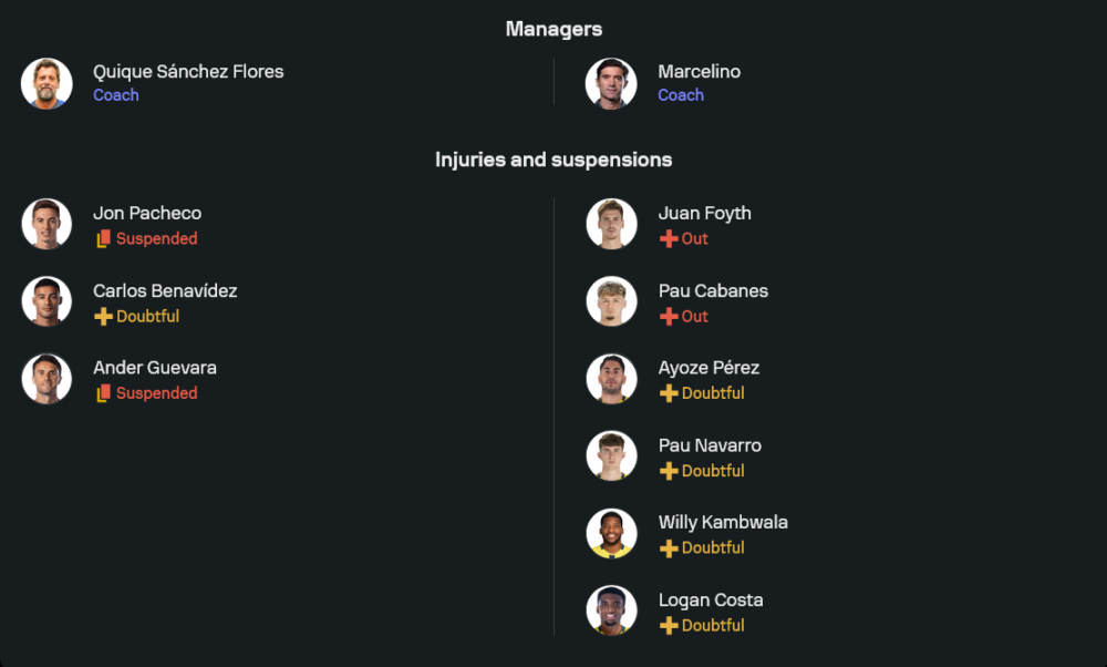 อลาเบสของกีเก้ ซานเชซ ฟลอเรส มีปัญหาพอสมควร เพราะจะหมดสิทธิ์ใช้งาน โฆน ปาเชโก้ และ อันเดร์ กูเอบาร่า ที่ติดโทษแบน รวมถึง ฟากุนโด้ การ์เซส ที่ยังหมดสิทธิ์ลงสนามต่อเนื่อง ส่วน การ์ลอส เบนาวิเดซ ยังต้องรอเช็กความฟิต ทำให้เกมนี้เจ้าถิ่นน่าจะมาในระบบ 4-4-2 ตามเดิม โดยฝากความหวังในแนวรุกไว้ที่ โตนี่ มาร์ติเนซ กับ ลูกัส โบเย่ ขณะที่แดนกลางยังต้องพึ่งการคุมจังหวะของ อันโตนิโอ บลังโก้ และ การ์เลส อาเลนญ่า เป็นหลัก จุดน่าห่วงยังคงเป็นเกมรับที่เสียประตูง่ายเกินไปในช่วงหลัง
