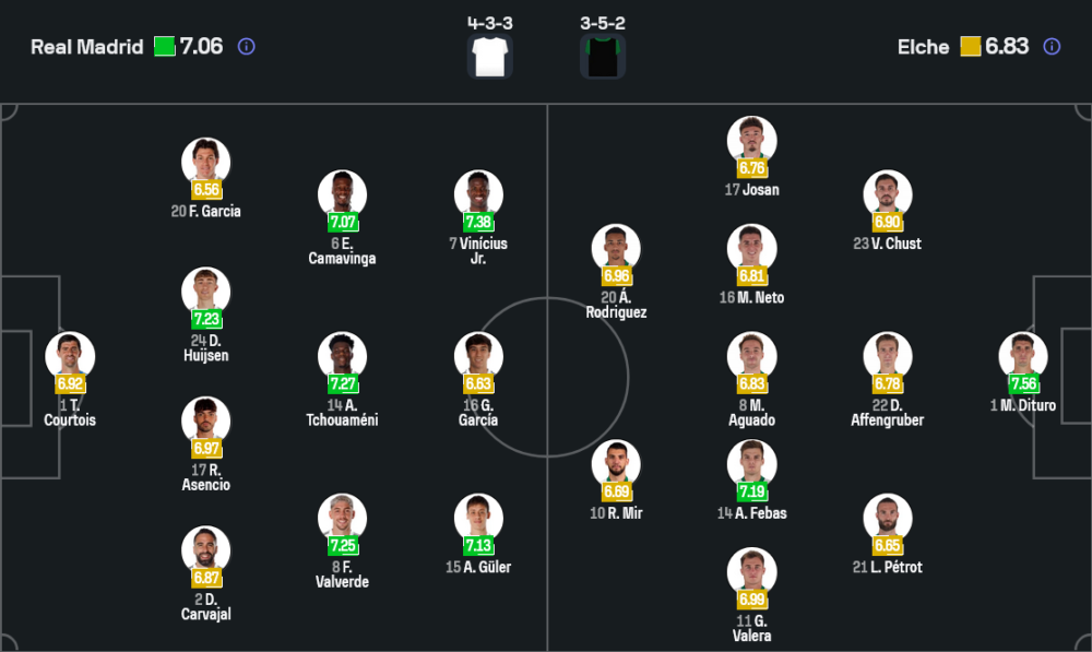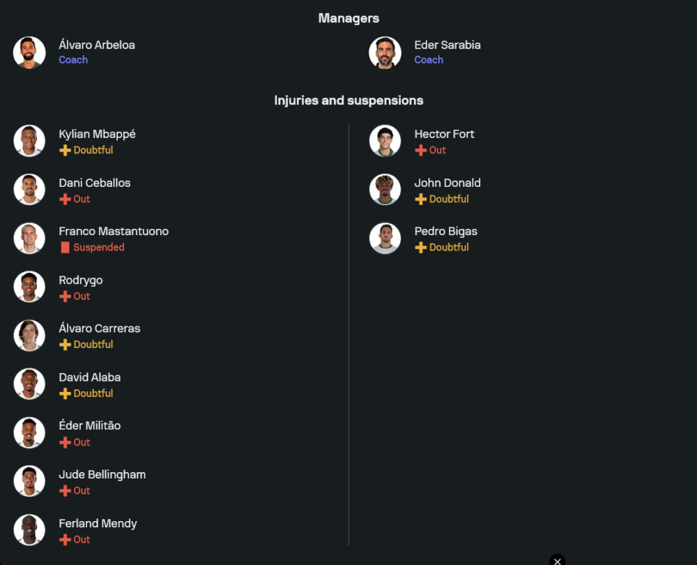 เจ้าถิ่นยังไม่มี เอแดร์ มิลิเตา, คิเลียน เอ็มบัปเป้, โรดรีโก้ และ จู๊ด เบลลิงแฮม ที่ยังบาดเจ็บ รวมถึง ฟรังโก้ มาสตันตูโอโน่ ที่ติดโทษแบน แต่ขุมกำลังที่เหลือยังแข็งแกร่งพอจะเดินเกมรุกได้เต็มที่ ระบบที่ใช้คาดว่าเป็น 4-3-3 โดยมี ติโบต์ กูร์กตัวส์ เฝ้าเสา แดนกลางใช้ วัลเวร์เด้, คามาวิงก้า และ ชูอาเมนี่ คุมจังหวะ ส่วน อาร์ด้า กูแลร์ ทำเกมรุกอยู่หลัง วินิซิอุส จูเนียร์ กับ กอนซาโล่ การ์เซีย จุดเด่นของชุดนี้คือสปีดเกมและการเข้าทำในพื้นที่สุดท้ายที่ยังอันตรายเหมือนเดิม