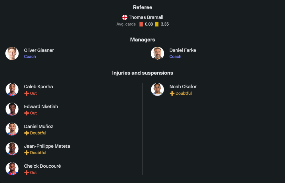 โอลิเวอร์ กลาสเนอร์ ยังมีปัญหานักเตะเจ็บบางราย โดย เอ็ดดี้ เอ็นเคเตียห์ และ ดาเนี่ยล มูนญอซ ยังไม่พร้อมเต็มที่ แต่แกนหลักส่วนใหญ่ยังอยู่กันครบ คาดว่าจะยึดระบบ 3-4-2-1 เหมือนเดิม วาง ฌ็อง-ฟิลิปเป้ มาเตต้า ยืนหน้าเป้า โดยมี อิสไมล่า ซาร์ และ อีวานน์ เกสซ็องด์ คอยทำเกมด้านหลัง จุดเด่นของพาเลซคือการเปลี่ยนเกมเร็วและเล่นในบ้านได้ค่อนข้างดุดัน