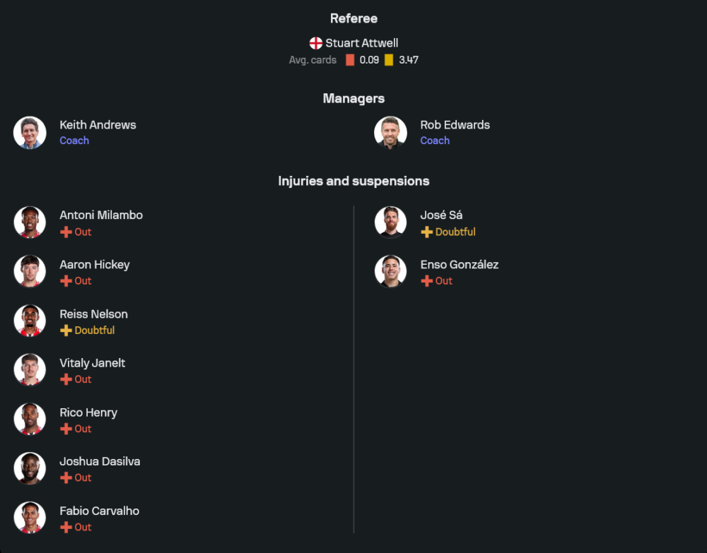 ฝั่ง ร็อบ เอ็ดเวิร์ดส์ มีปัญหาน้อยกว่า โดยขาดเพียง เลออน ชิโวม และ เอ็นโซ่ กอนซาเลซ ที่เดี้ยงยาวอยู่เดิม คาดว่าจะยึดระบบ 3-5-2 เหมือนเดิม มี อดัม อาร์มสตรอง เป็นตัวจบสกอร์ และใช้ อังเกล โกเมส กับ ฮวาง ฮี ชาน ทำเกมรุกด้านหลัง จุดแข็งของทีมชุดนี้คือความคล่องในการสวนกลับ ถ้าตั้งรับแล้วเปลี่ยนจังหวะได้ดี วูล์ฟส์มีสิทธิ์สร้างปัญหาให้เจ้าถิ่นแน่