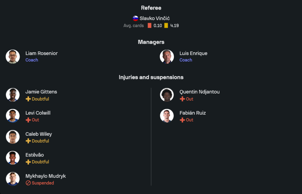 เชลซีของ เลียม โรเซเนียร์ เตรียมมาในระบบ 4-2-3-1 โดยยังมีแกนหลักอย่าง โรเบิร์ต ซานเชซ, รีซ เจมส์, เวสลีย์ โฟฟาน่า, มอยเซส ไกเซโด้, เอ็นโซ่ เฟร์นานเดซ และ โคล พาลเมอร์ พร้อมเป็นตัวขับเคลื่อนเกมรุก จุดที่น่าห่วงคือสภาพทีมยังไม่สมบูรณ์เต็มร้อย เพราะมีทั้ง เลวี โคลวิลล์ ที่บาดเจ็บ, มิไคโล มูดริค ที่ติดโทษแบน รวมถึงบางรายที่ยังต้องเช็กความฟิต ทำให้การจัดทัพของเจ้าบ้านอาจไม่ไหลลื่นอย่างที่ต้องการ