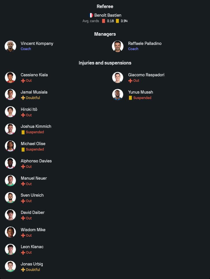 ทีมของ แว็งซ็องต์ ก็องปานี ยังมีปัญหาตัวเจ็บและตัวแบนหลายราย โดยเฉพาะ โยชัว คิมมิช กับ ไมเคิ่ล โอลิเซ่ ที่ติดโทษแบน ส่วนผู้เล่นอย่าง มานูเอล นอยเออร์, ฮิโรกิ อิโตะ, อัลฟองโซ่ เดวี่ส์, จามาล มูเซียล่า, โยนาส อูร์บิก, ลีออน คลานัช และ สเวน อุลไรช์ ต่างยังไม่พร้อมลงสนาม ทำให้เกมนี้อาจต้องใช้ เลโอนาร์ด เพรสคอตต์ ดาวรุ่งวัย 16 ปีเฝ้าเสาอีกครั้ง ระบบที่คาดคือ 4-2-3-1 มี อเล็กซานดาร์ พาฟโลวิช กับ เลออน โกเร็ตซ์ก้า คุมกลาง พร้อมวาง เลนนาร์ต คาร์ล, เซิร์จ นาบรี้ และ หลุยส์ ดิอ๊าซ ทำเกมรุกหลัง นิโคลัส แจ็คสัน แม้ขุมกำลังไม่เต็มร้อย แต่คุณภาพแนวรุกยังอันตรายพอจะกดดันแนวรับทีมเยือนได้ตลอดเกม